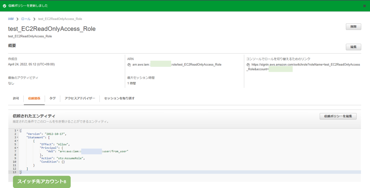 スイッチ元アカウントAの特定のユーザしかロールを引き受けないように、IAM ロールの信頼ポリシーを編集しました。