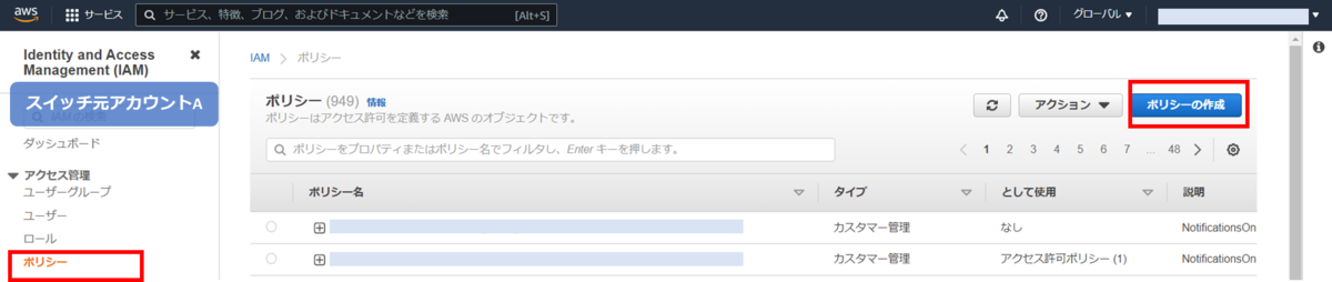 スイッチ元アカウントAで、ユーザに付与するアイデンティティベースのポリシーを作成します。AWS マネジメントコンソールで IAM の画面に遷移し、[ポリシー]-[ポリシーの作成]をクリックします。