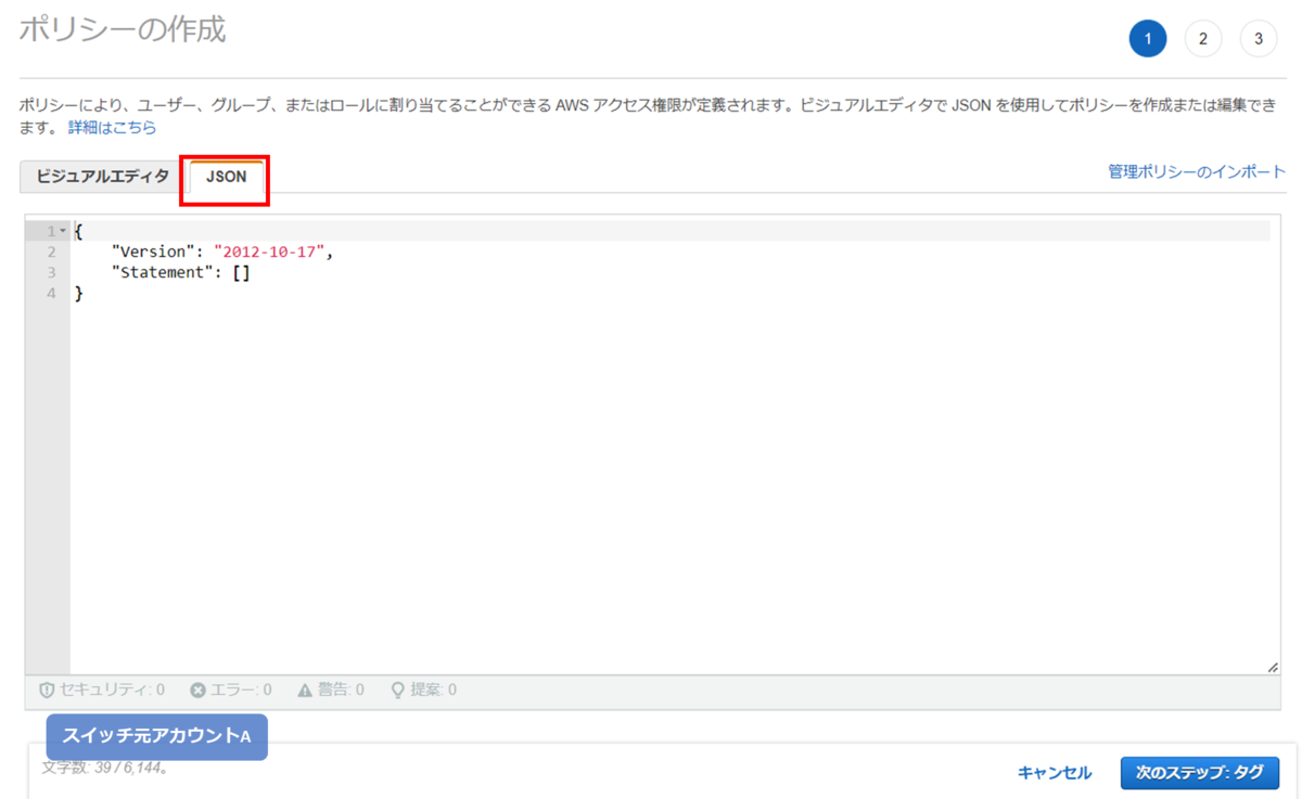 [JSON]タブをクリックすると、最初は以下のようにJSONポリシーの枠だけが存在します。