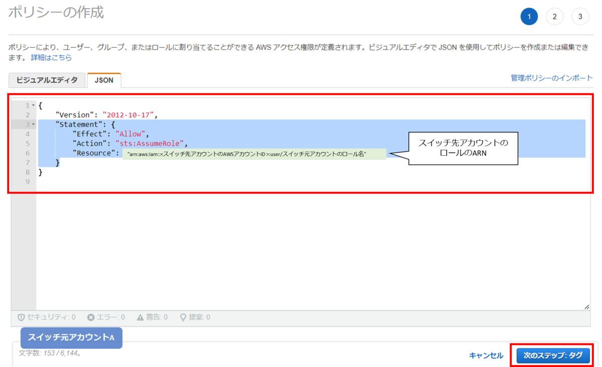 以下のJSONポリシーを貼り付けます。