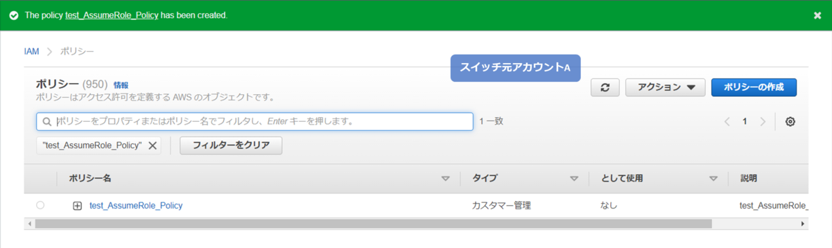 - スイッチ元アカウントAの IAMユーザを信頼するポリシー