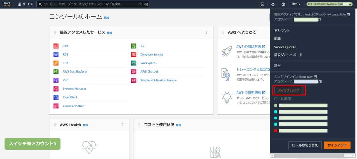 スイッチ元アカウントAとスイッチ先アカウントBを行き来しますので、別々のブラウザでログインするなど工夫して、どちらの AWS アカウントにいるのか間違えないようにしましょう。