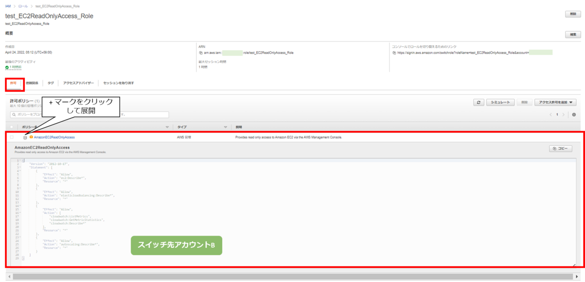 作成した IAM ロールを選択し、ポリシーを確認していきます。[許可]タブをクリックすると、アイデンティティベースのポリシーが表示されます。今回はAmazonEC2ReadOnlyAccessを付与していますので、以下のようなJSONポリシードキュメントが記載されています。