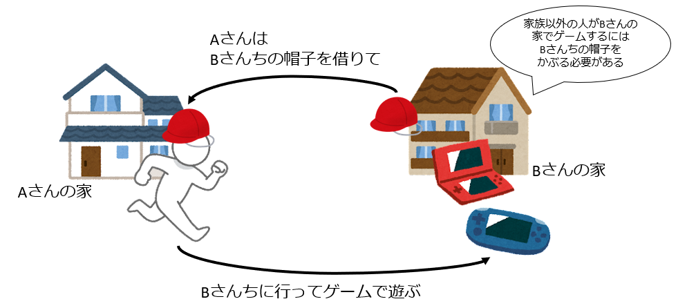 家族以外の人がBさんの家でゲームをするには、Bさんの家の帽子をかぶってBさんの家にお邪魔する必要があります。AさんはBさんの家の帽子を借りて、Bさんの家に行ってゲームで遊びます。