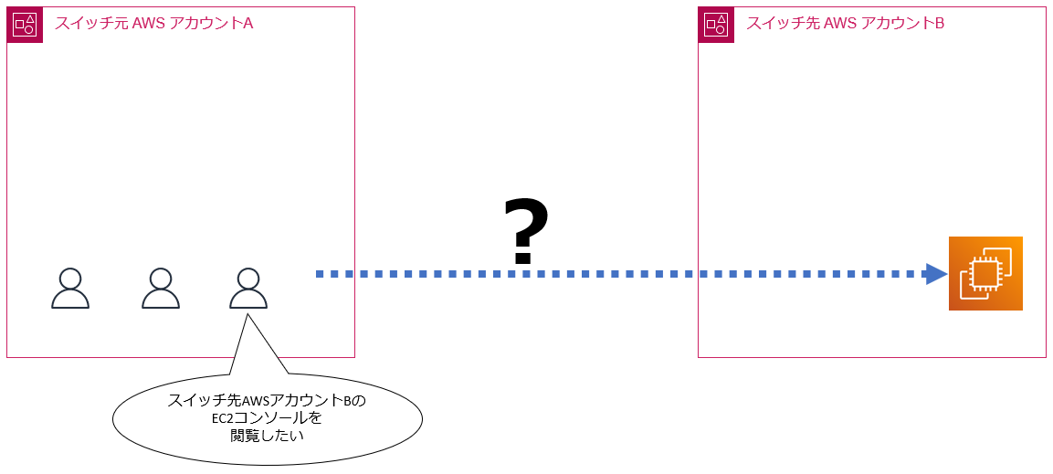 まず、スイッチ元アカウントAのユーザが、スイッチ先アカウントBのEC2コンソールを閲覧したいなあと思っています。しかし、このままではアカウントをまたいでのアクセスはできません。