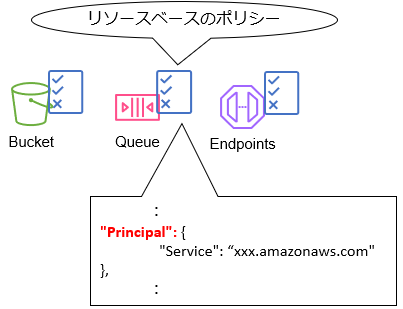- 代表的なものは、Amazon S3 バケットポリシー、 Amazon SQS キューポリシーなど
