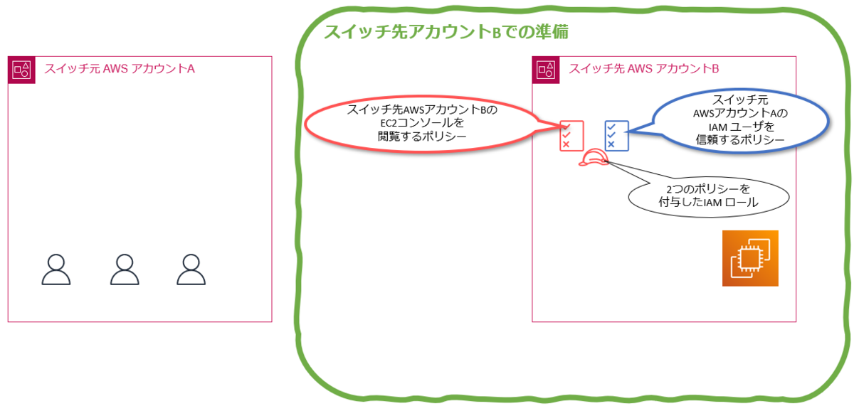 スイッチ元アカウントAのユーザが、スイッチ先アカウントBの IAM ロールを引き受けます。 スイッチ元アカウントAのユーザは、スイッチ先アカウントBのEC2コンソールを閲覧することができるようになります。