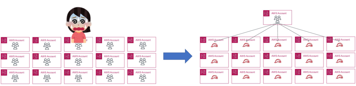 複数、または多くの AWS アカウントを使用してシステムを構成する際、一つ一つのアカウントに IAM ユーザを一人ずつ作成する作業は大変で、ポリシー管理も煩雑になります。