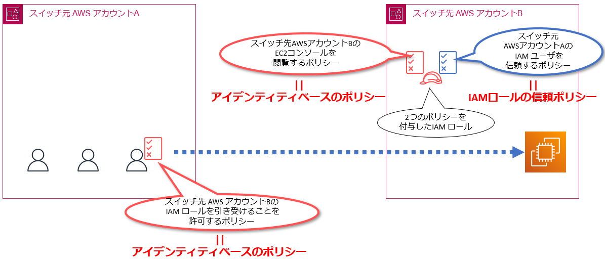 「スイッチロールのイメージ」で記載した各種ポリシーをもう一度まとめますと、以下の図のようになります。
