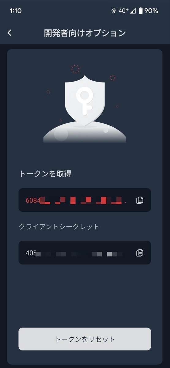その中にトークンやシークレットキーが表示されますので、取得できます。