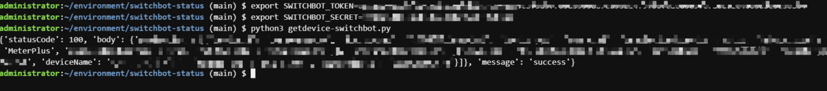 export SWITCHBOT_TOKEN=1234567891234567 #アプリから取得したトークンを記載 export SWITCHBOT_SECRET=123456789 #アプリから取得したシークレットを記載