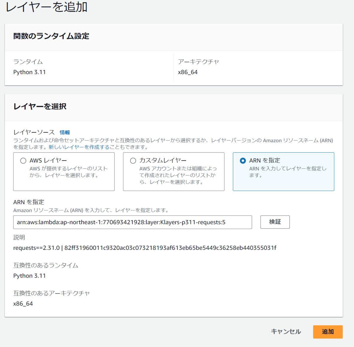 Pythonバージョン、モジュール毎にARNで公開されていますので、それを指定し利用することにしました。