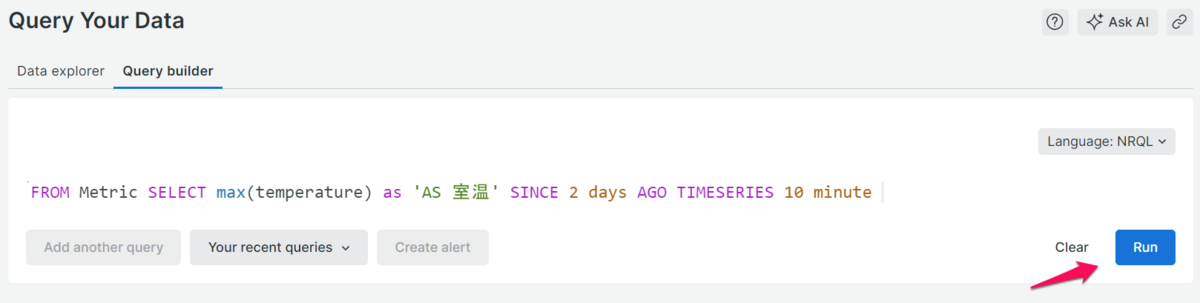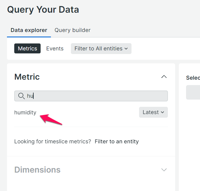 Data explorerからMetric名を指定してデータを探していきます。今回はtemperature(温度)とhumidity(湿度)が対象データなので部分入力して探します。