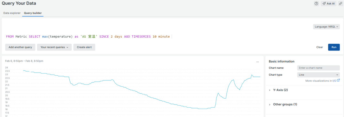 更に今回はNew Relic側のAPIも無料で利用が出来たので、さくっとSwitchBotのセンサーデータを監視することが出来るようになりました。実際にグラフ生成することも出来てかなり面白かったですね。