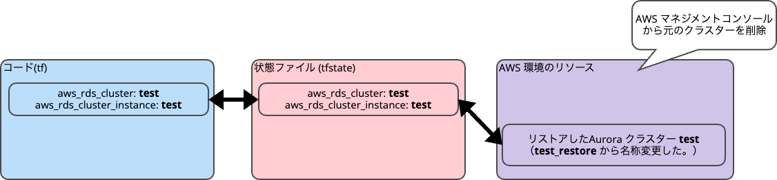 最後に、リストアした新しいクラスターを、元のクラスターを作成した Terraform コード(resource 名:aws_rds_cluster.test)で管理するには、状態ファイル (tfstate) の対応付けを変更する必要があります。