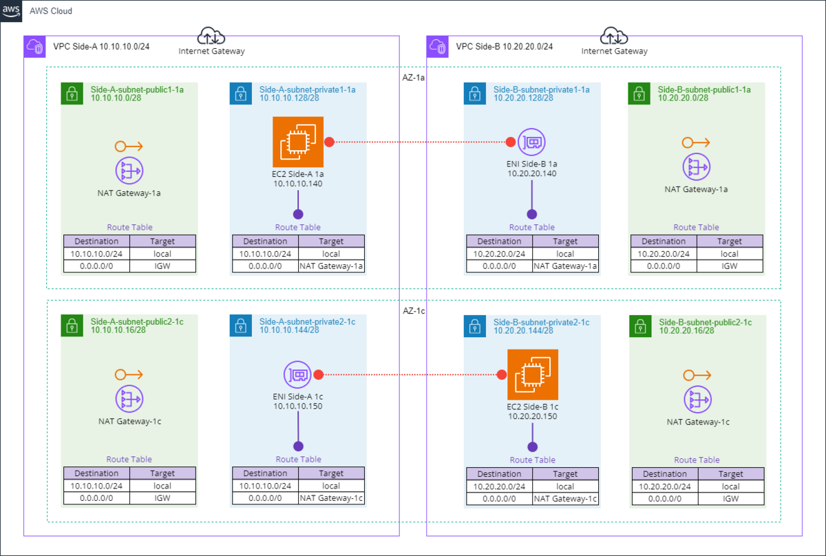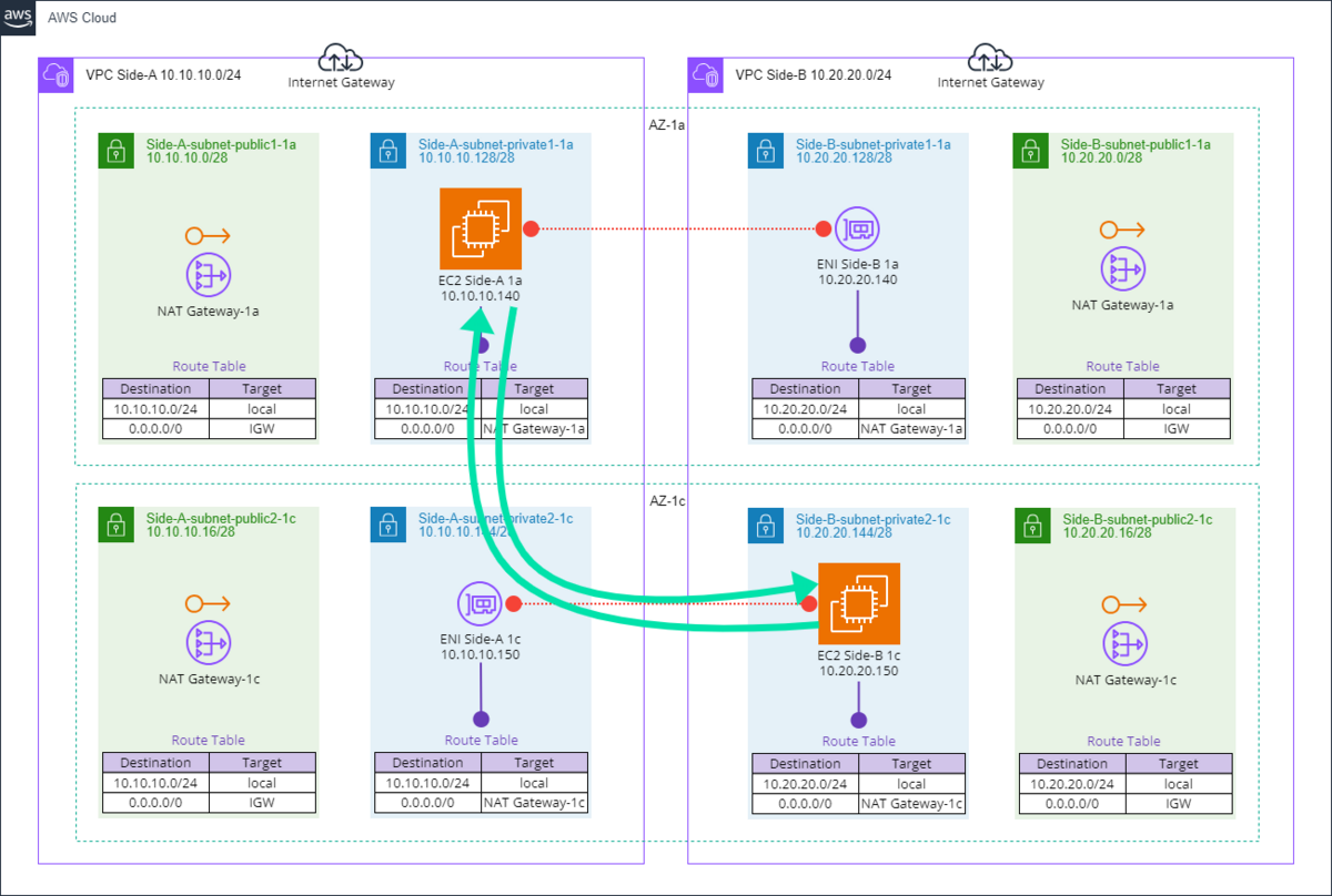 この状況で、左上にある「EC2 Side-A 1a 10.10.10.140」から右下にある「EC2 Side-B 1c 10.20.20.150」への通信とその逆をそれぞれ検証します。