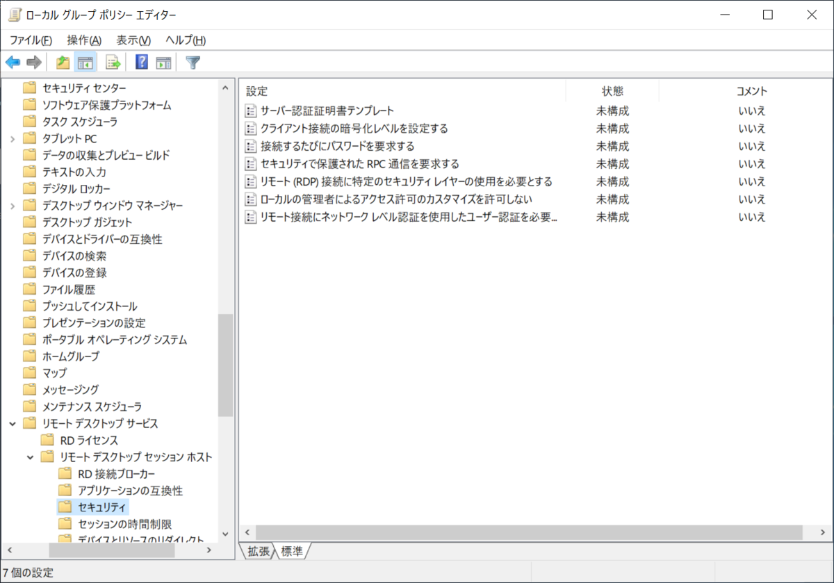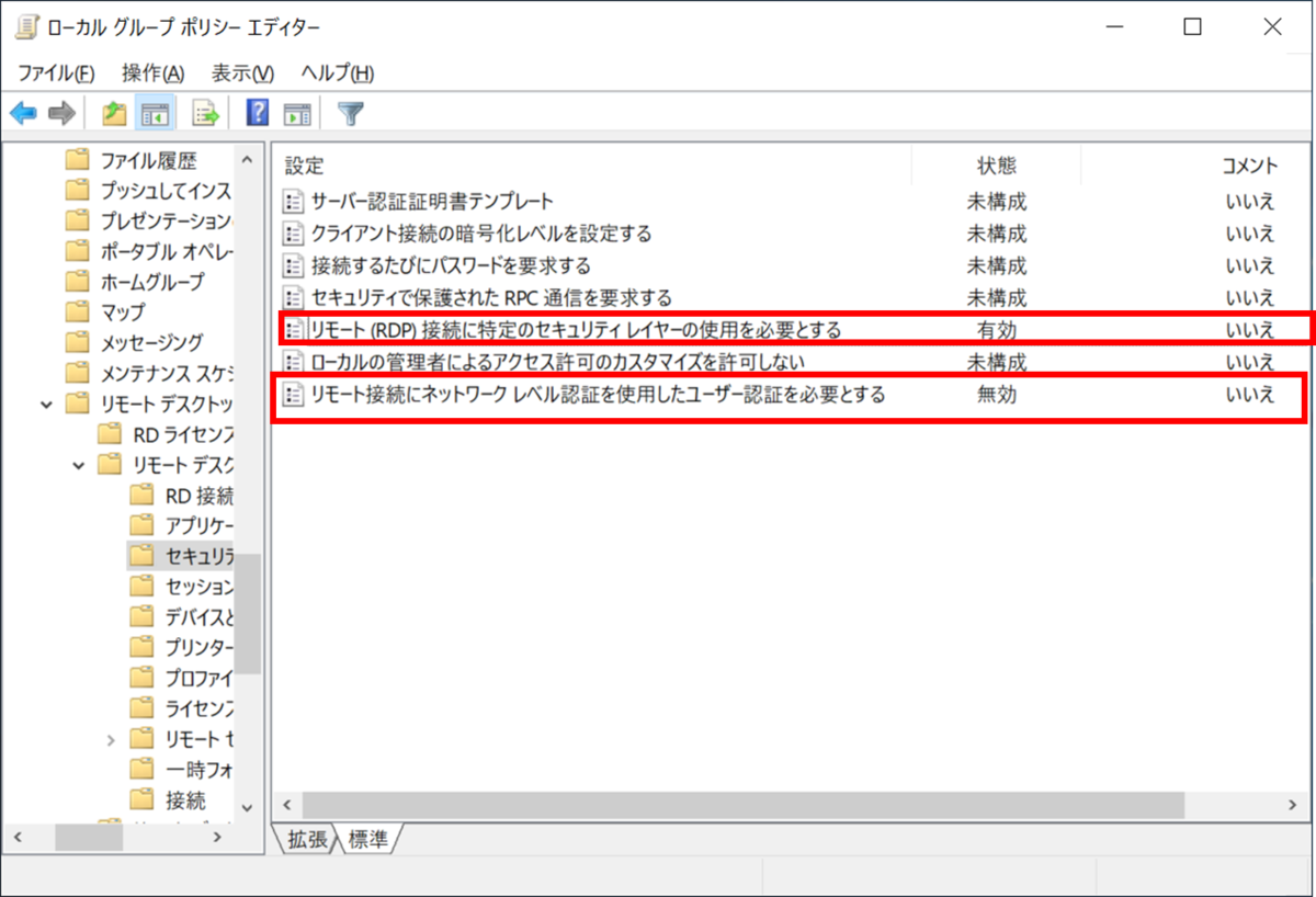 [コンピューターの構成]-[管理用テンプレート]-[Windows コンポーネント]-[リモート デスクトップ サービス]-[リモート デスクトップ セッション ホスト]-[セキュリティ]