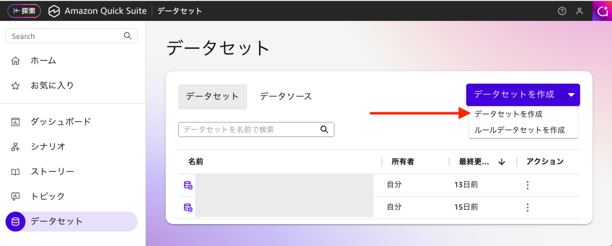 次に、Amazon Quick Suite のクイックサイト機能で、「データソースを作成」→「データセットを作成」の順番で実装を進めます。