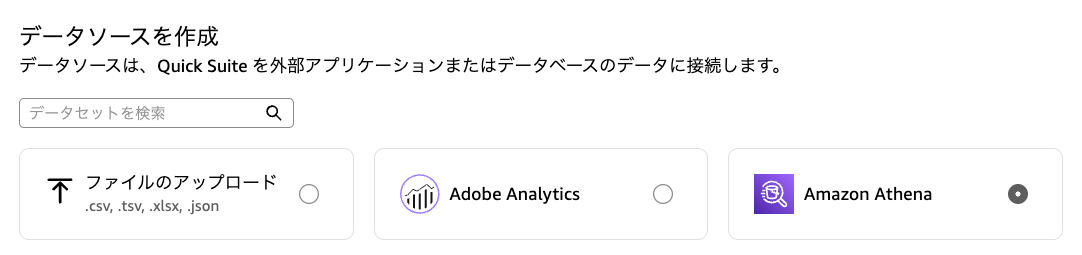 - 手順4. Amazon Quick Suite (QuickSight) の管理画面で、Athenaをデータソースとして作成する